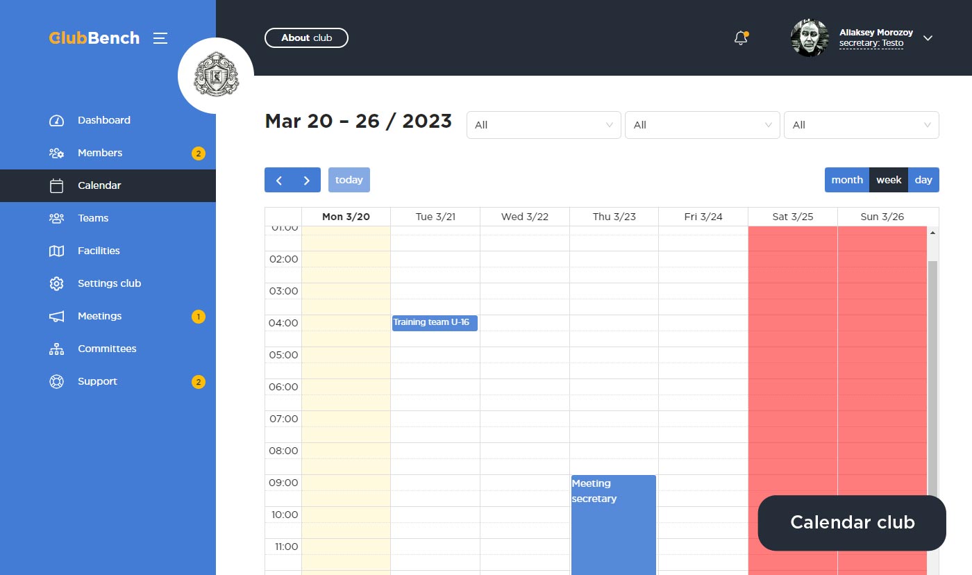Клубному секретарю доступен календарь по всем созданным собраниям и тренировкам, которые создали участники на клубных объектах. В фильтре календаря имеется возможность сделать выборку расписания по клубным объектам и командам.