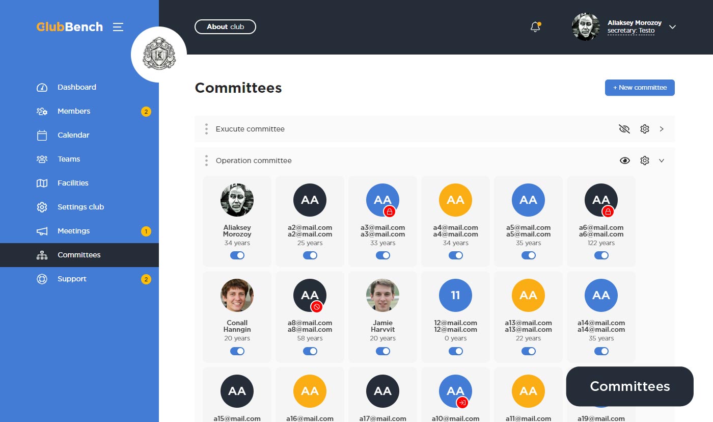 В раздела «Committees», вы можете создать неограниченное кол-во комитетов и добавлять туда участников. Все клубные участники будут видеть созданные вами комитеты и видеть добавленных туда участников. Данный раздел для редактирования доступен только клубному секретарю, всем остальным участникам клуба он доступен только для просмотра.
