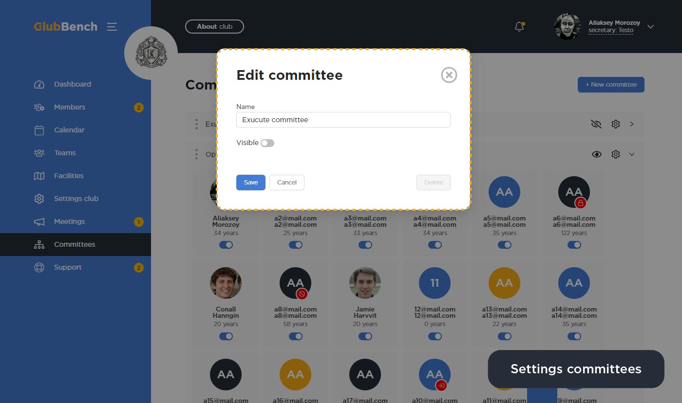 Также вы (клубный секретарь) можете сделать скрытый комитет, который будет отображаться только для вас. Для этого в настройках доступна функция «Visible».