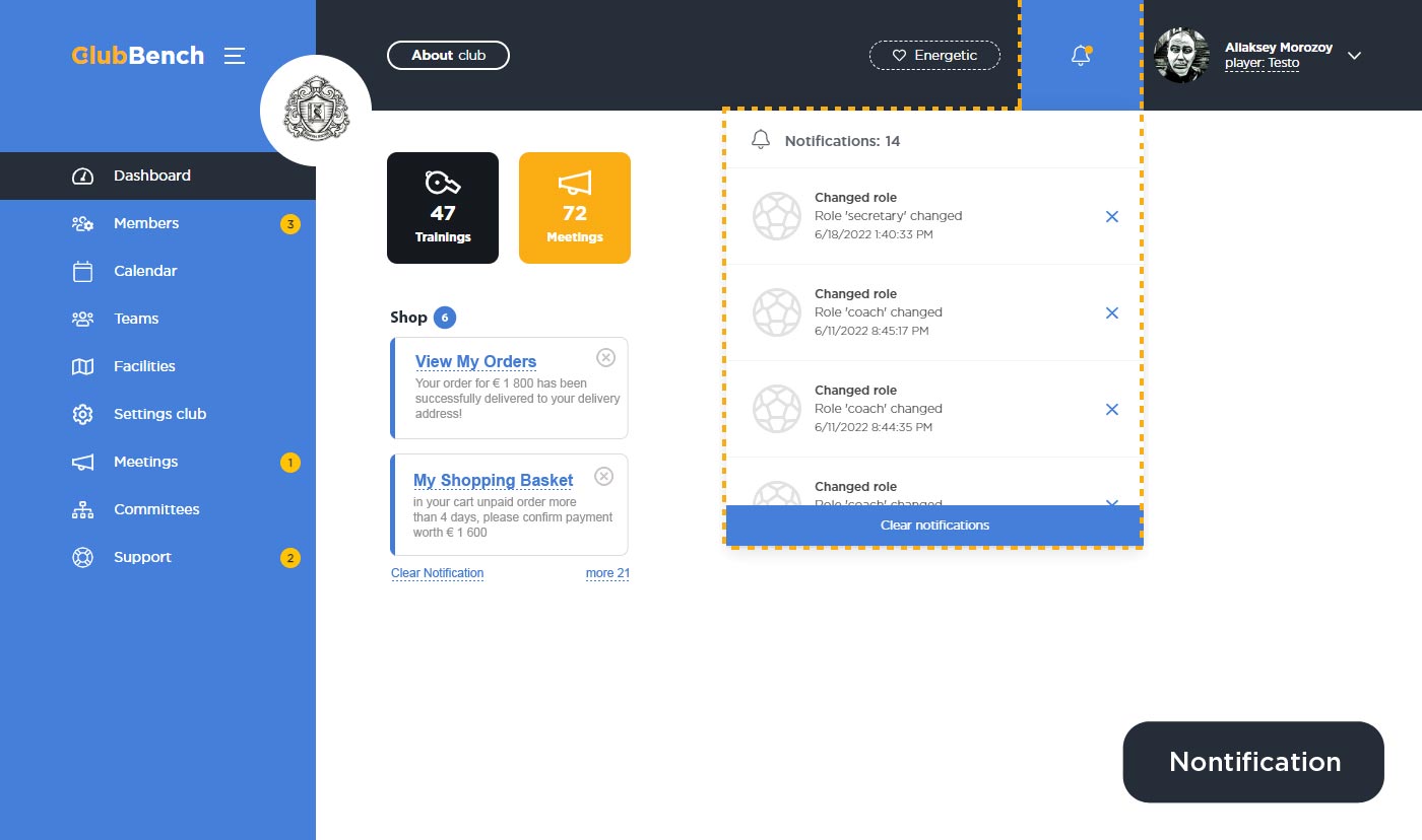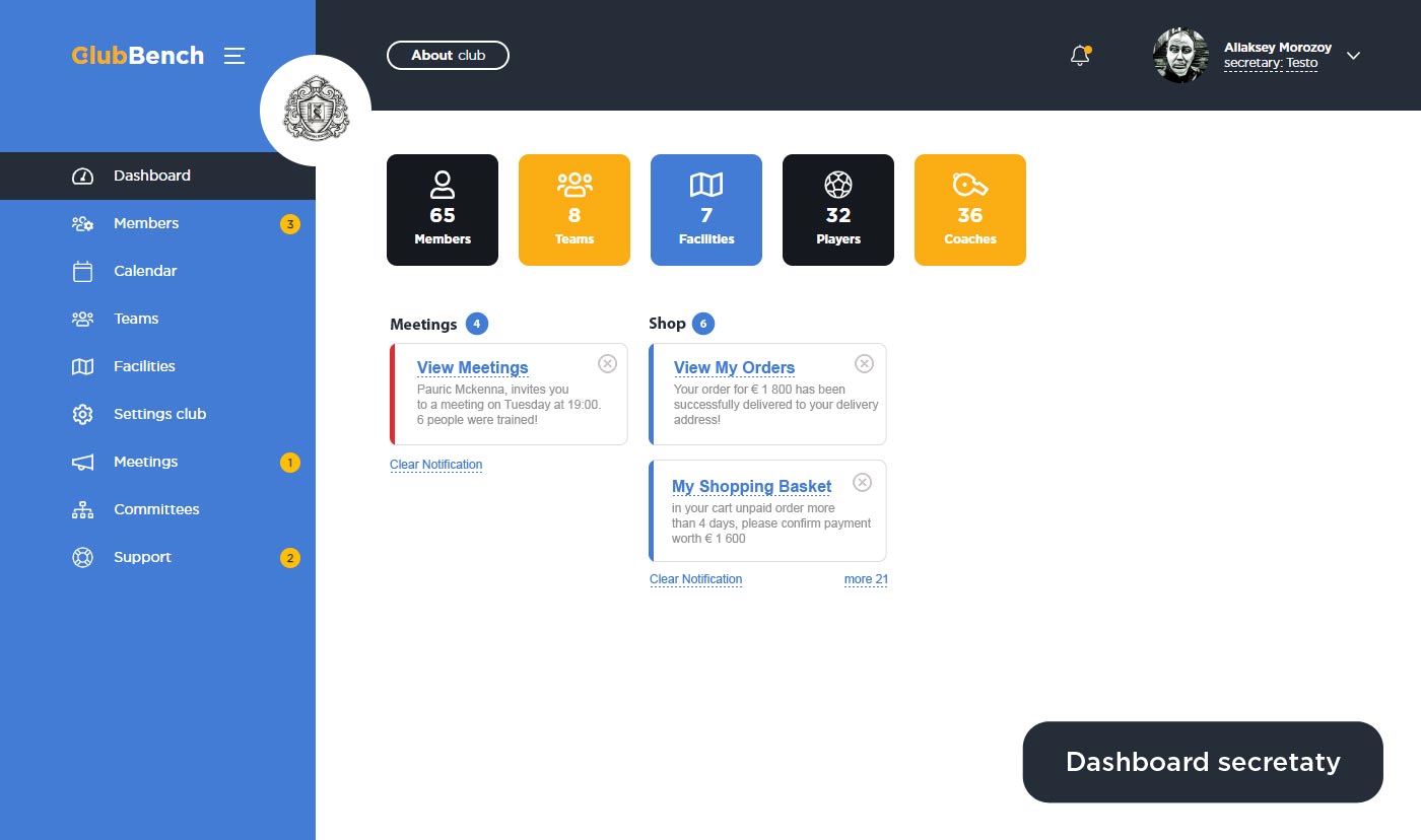 Также на дашборде размещены информационные виджеты которые показывают общие параметры в зависимости от вашего личного кабинета. Например, у секретаря показываются специальные виджеты, где отображаются участники клуба, кол-во клубных команд и т.д. У тренера и игрока, отображается кол-во проведенных тренировок и собраний.
