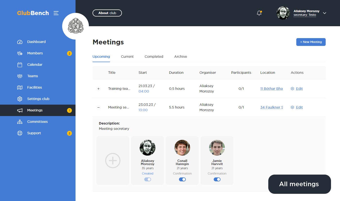 Раздел собрания имеет одинаковый функционал для всех клубных ролей. Создав собрания вы можете пригласить через поиск, абсолютно любого клубного участника. После чего приглашенным участникам придет уведомление, а также возможность принять или отклонить ваше предложение.