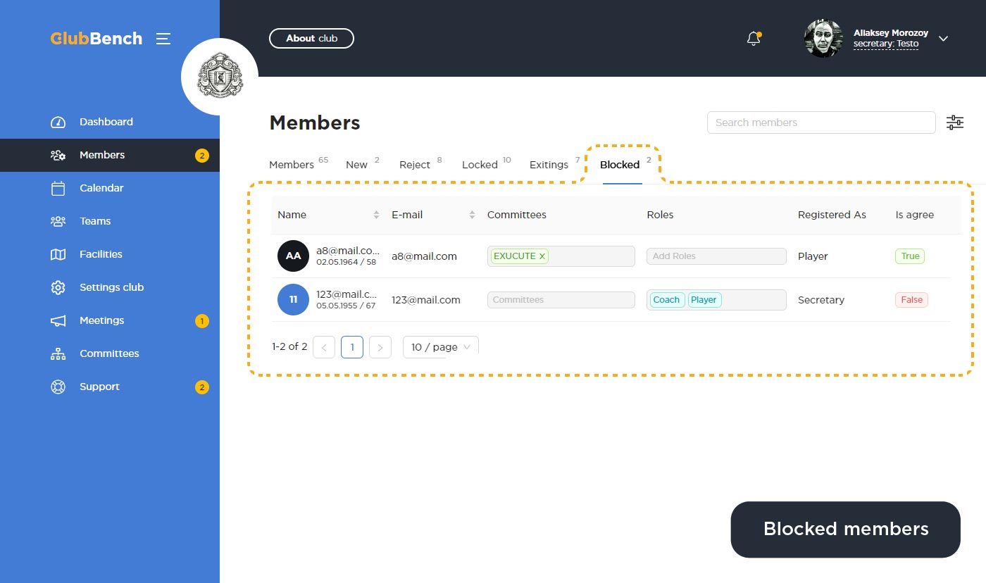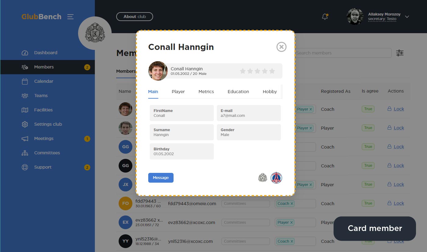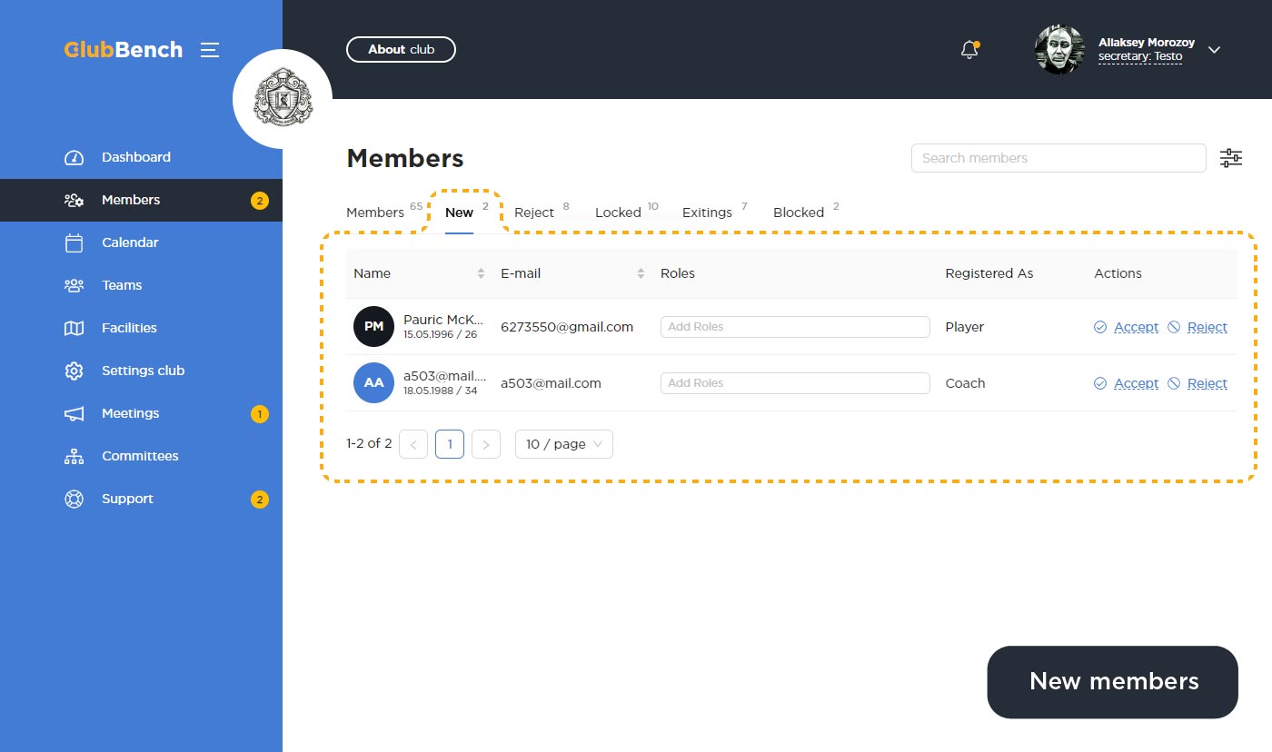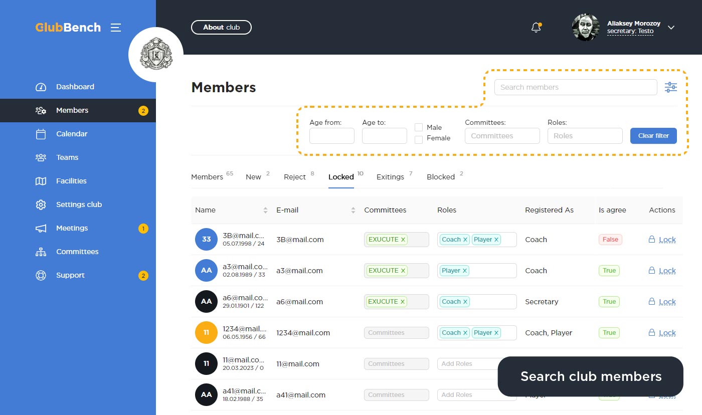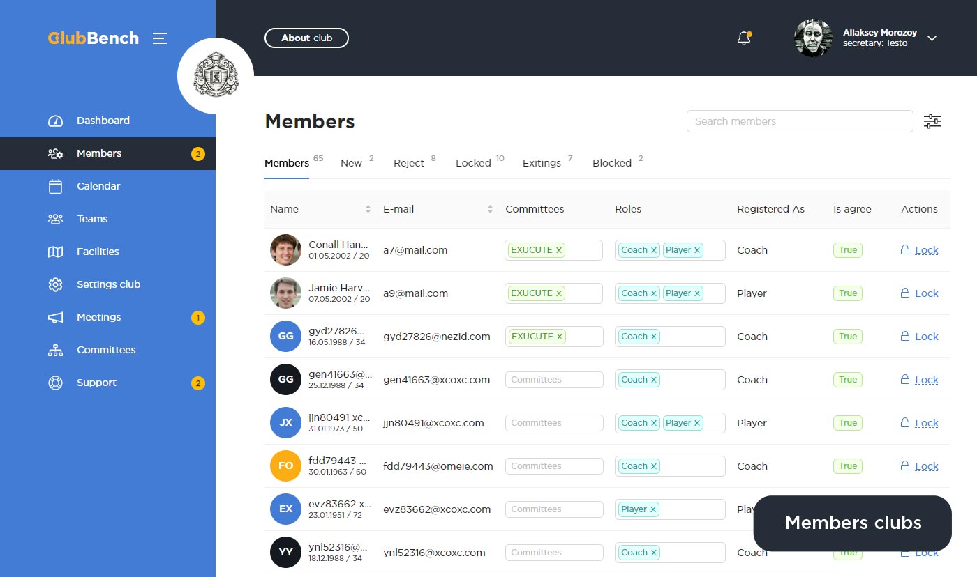 Функционал для работы с пользователями доступен только в личном кабинете секретаря. В данном разделе секретарю предлагается работа со всеми участниками клуба, а именно: