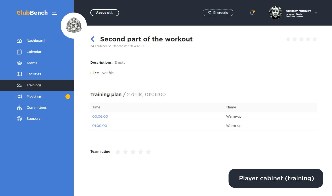 Личный кабинет тренера и игрока отличается лишь разделом «Trainings», для каждой роли у него разный набор возможностей в работе. Тренеру доступная функциональная часть создания и заполнения тренировок, а также выставление оценок. А игроку отображение информации о предстоящих тренировок, а также оценки выставленные за прошедшие тренировки.