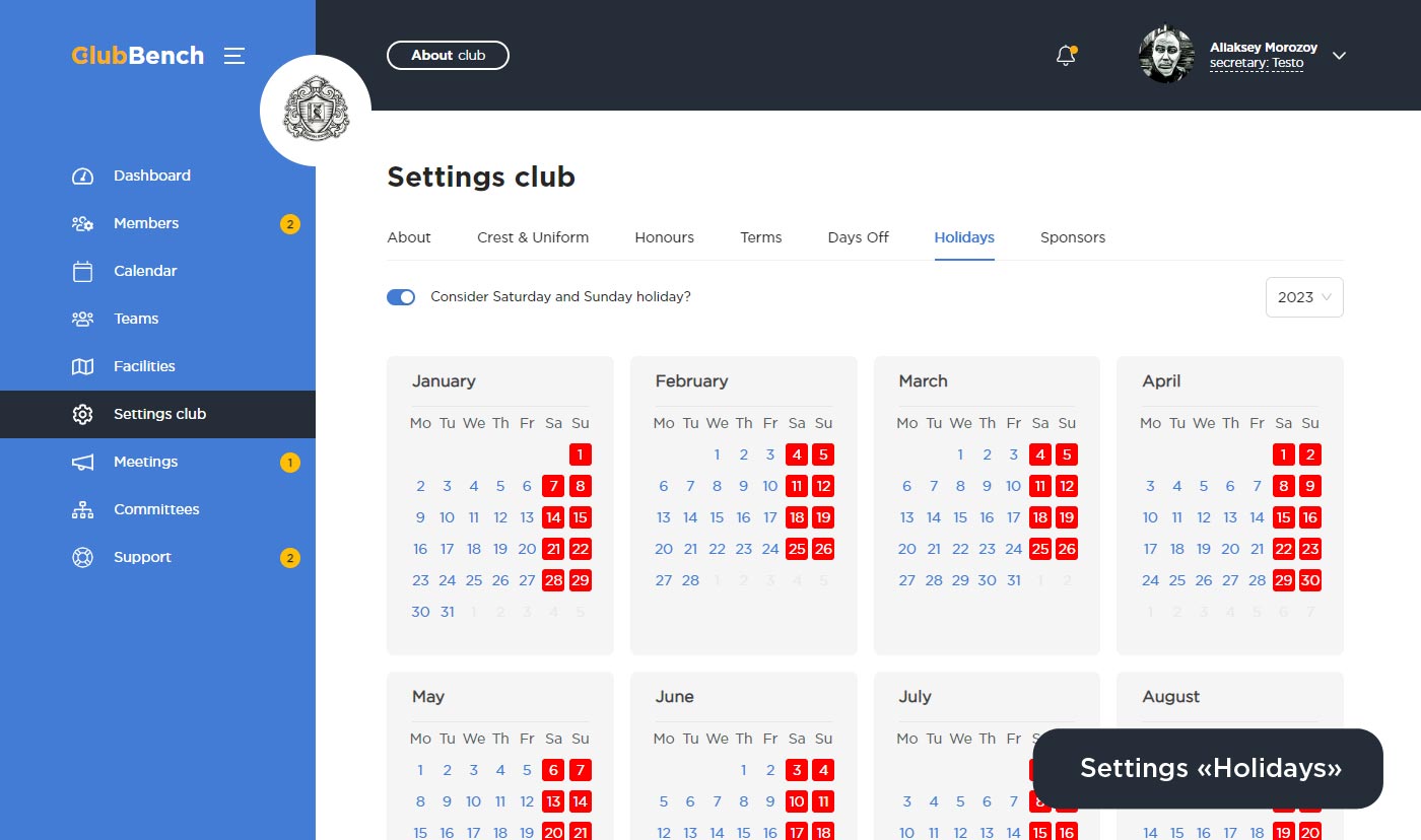 Данная настройка позволяет задать выходные дни для всего клубного календаря. Выбранные выходные/праздничные дни будут подсвечиваться в общем календаре для всех спортивных объектов красным цветом. Никаких функциональных ограничений выделение выходных дней не дает, только визуально отмечает выходные дни красным цветом для удобства работы.