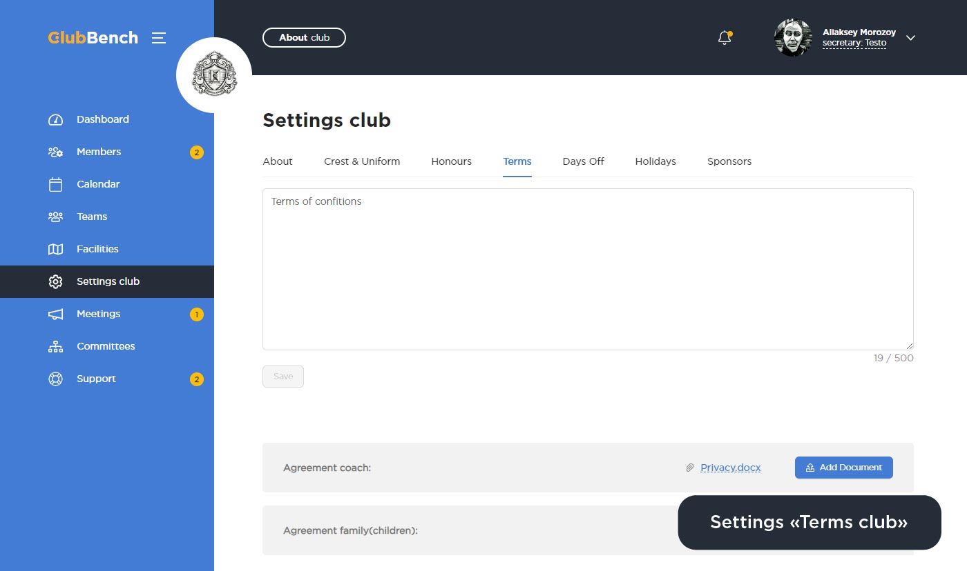Раздел «Settings club» доступ только в личном кабинете секретаря, так как отвечает за основные настройки клуба. Остальным клубным ролям, он невиден и не доступен для работы. Данный раздел клубных настроек, состоит из следующих управленческих разделов: