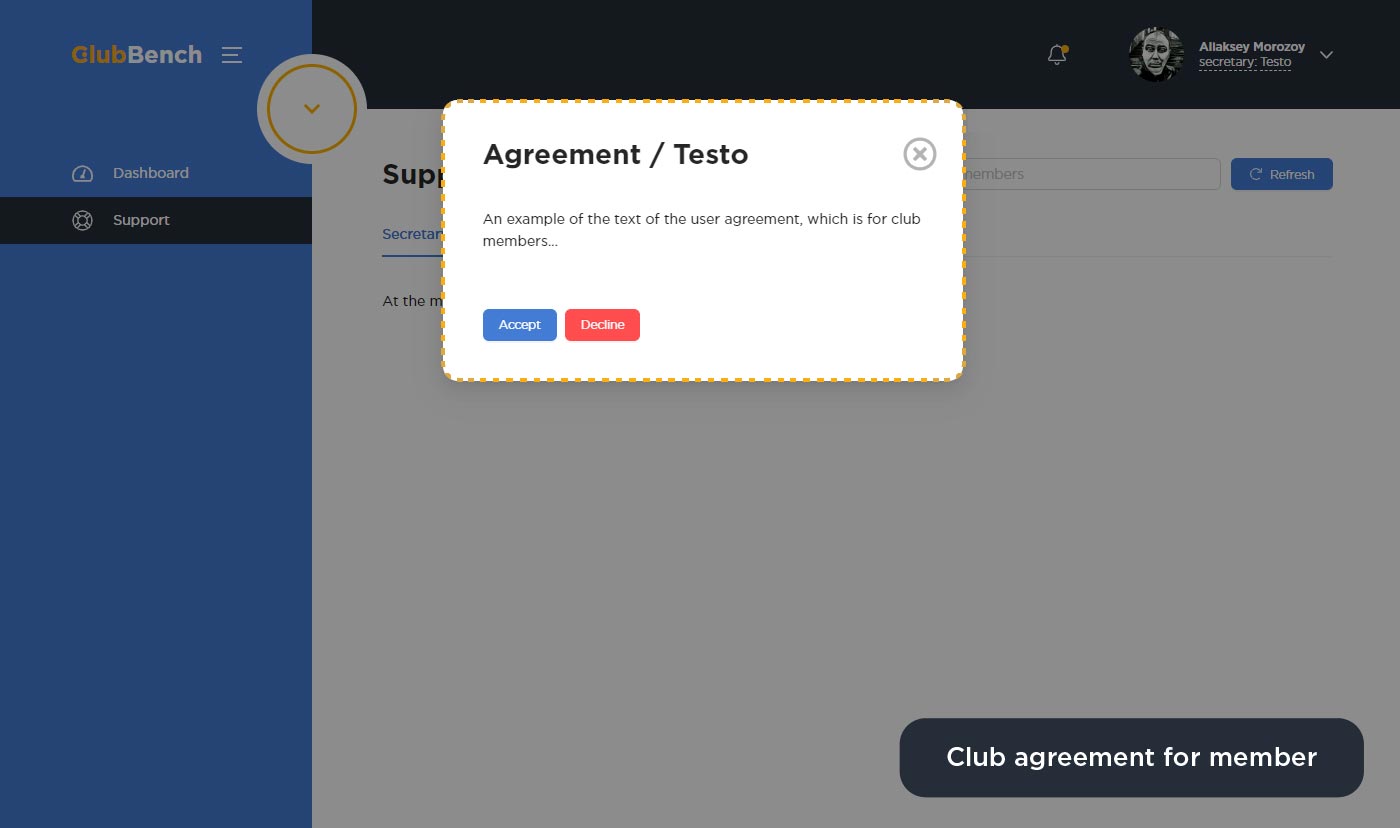 Когда вы подтверждаете пользователя через раздел «Users» и присваиваете ему личный кабинет. Участнику приходит пользовательское соглашение, после принятия которого он может начать работу в вашем клубе. Эта вкладка как раз отвечает, за загрузку того самого пользовательского соглашения, которое увидит и примет одобренный вами клубный участник.